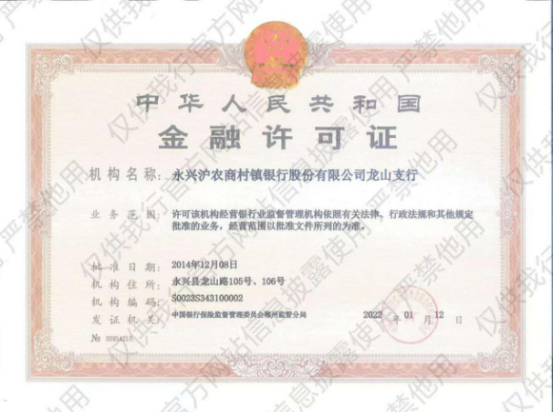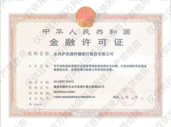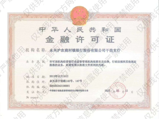 根据《银行保险机构许可证管理办法》(中国银行保险监督管理委员会令2021年第3号)要求,现将永兴沪农商村镇银行3个网点金融许可证公示如下: